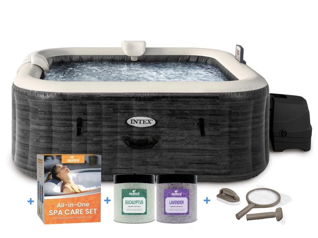 Met deze PREMIUM deal hoef je zelfs niet meer na te denken over wat je nog meer nodig hebt, want alles wat je nodig hebt om de spa te kunnen gebruiken wordt meegeleverd in de Aquatural All-in-One Spa Care Set voor opblaasbare jacuzzi’s en spa’s: alle onderhoudsmiddelen, twee heerlijke spa aroma’s en een handige set om de kwaliteit en hygiëne van het water te testen worden meegeleverd.