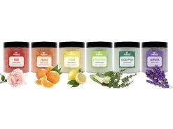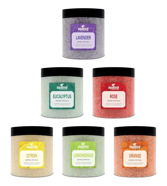 - 6 x 350 gram Aquatural Aroma Crystals: Roos, Sinaasappel, Citroen, Citroengras, Eucalyptus, Lavendel