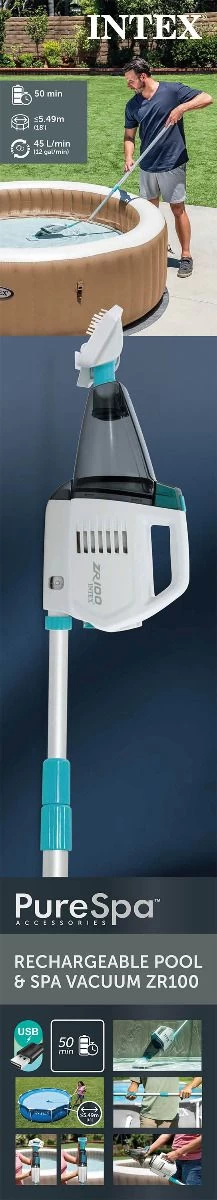 De Intex ZR100 is een oplaadbare stofzuiger die ideaal is voor het eenvoudig en snel reinigen van spa’s en middelgrote zwembaden.
