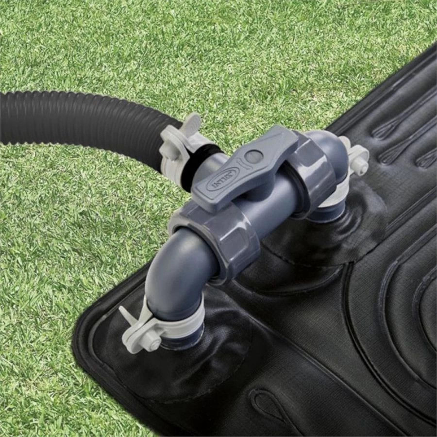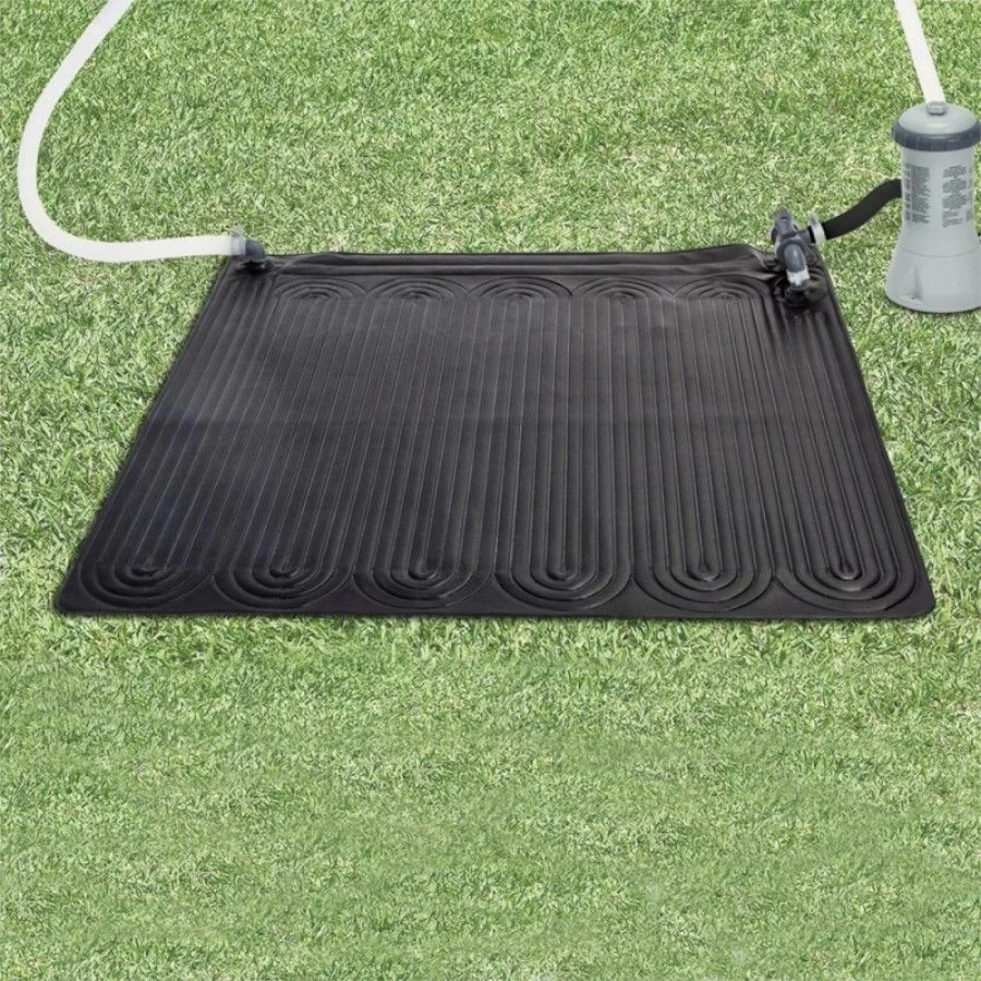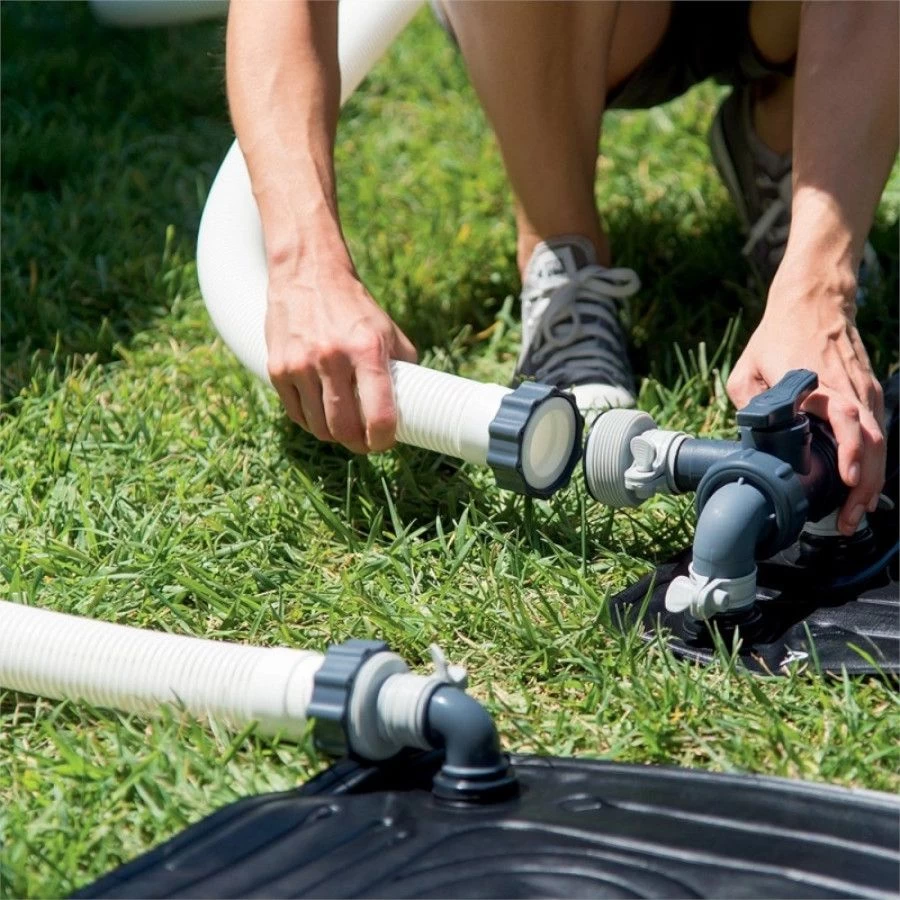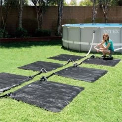 Met behulp van jouw zwembadpomp wordt er water door de zonnecollectoren gepompt. Het water wordt verwarmd door de zon als het in de donkere en warmte vasthoudende mat zit. Het verwarmde water stroom terug het zwembad in.
